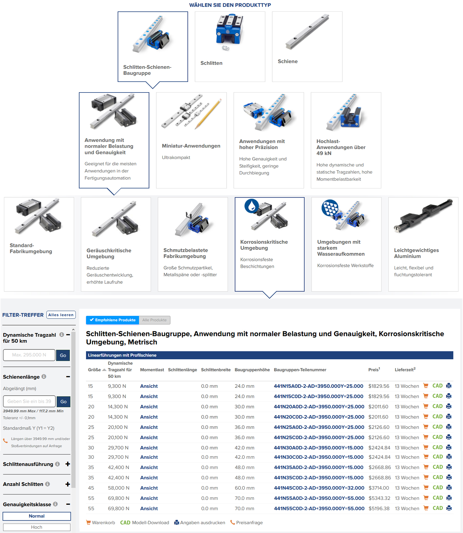 Über ein selbsterklärendes Menü mit den Hauptkategorien der Profilschienen-Linearführungen gelangt der Anwender mit wenigen Klicks zu einer Liste mit empfohlenen Lösungen für seine Anwendung. Anschließend lässt sich die Liste nach Parametern wie Last, Länge, Schlittenausführung, Genauigkeit und erforderliche Korrosionsfestigkeit filtern. Preise und Lieferzeiten werden vorab angezeigt, außerdem können sich die Anwender per Live-Chat unterstützen lassen – alles, ohne die Seite verlassen zu müssen.