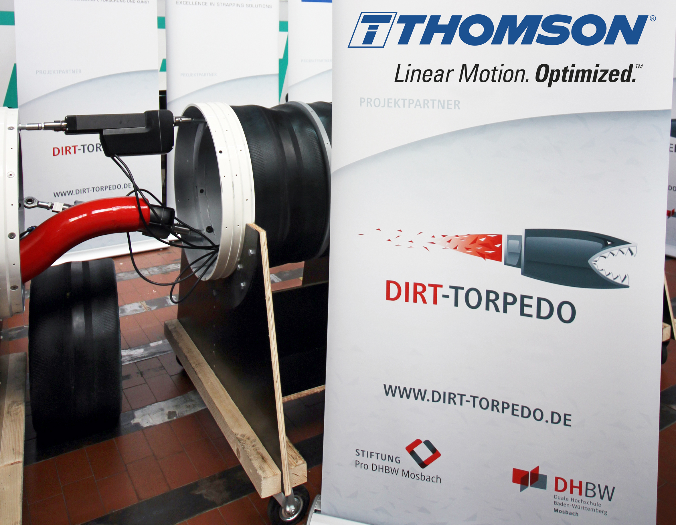 Thomson wird die in Mosbach ansässige Duale Hochschule Baden-Württemberg (DHBW) unterstützen, wo der ?Dirt-Torpedo‘ entwickelt wurde, ein von nur zwölf Wettbewerbskonzepten, die es in die engere Auswahl und damit ins Finale des Wettbewerbs geschafft haben. Treibende Kraft dieser Entwicklung ist die Idee einer schnellen, präzisen und vielseitig einsetzbaren Tunnelbohrmaschine. Die Bohrmaschine, deren Konstruktion und Funktionsweise an einen Regenwurm erinnert, verfügt über drei für die Fortbewegung zuständige Vortriebseinheiten. Hier kommen die Thomson Electrak HD-Aktuatoren zum Einsatz.