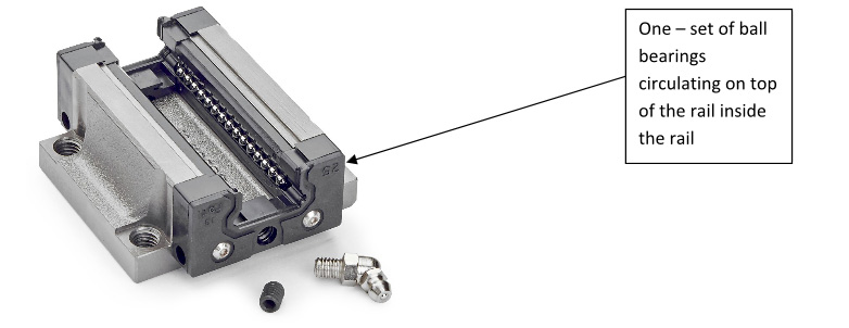 - With the double face architecture with ball bearings, rails are much more tolerant of mounting surface inaccuracies, but compromise rigidity and moment load capacity. It uses four bearing tracks, which are deployed face to face on the top of the rail, rather than inside of it (Figure 3). The double-faced bearing arrangement results in equal load-carrying capacity in all directions.
