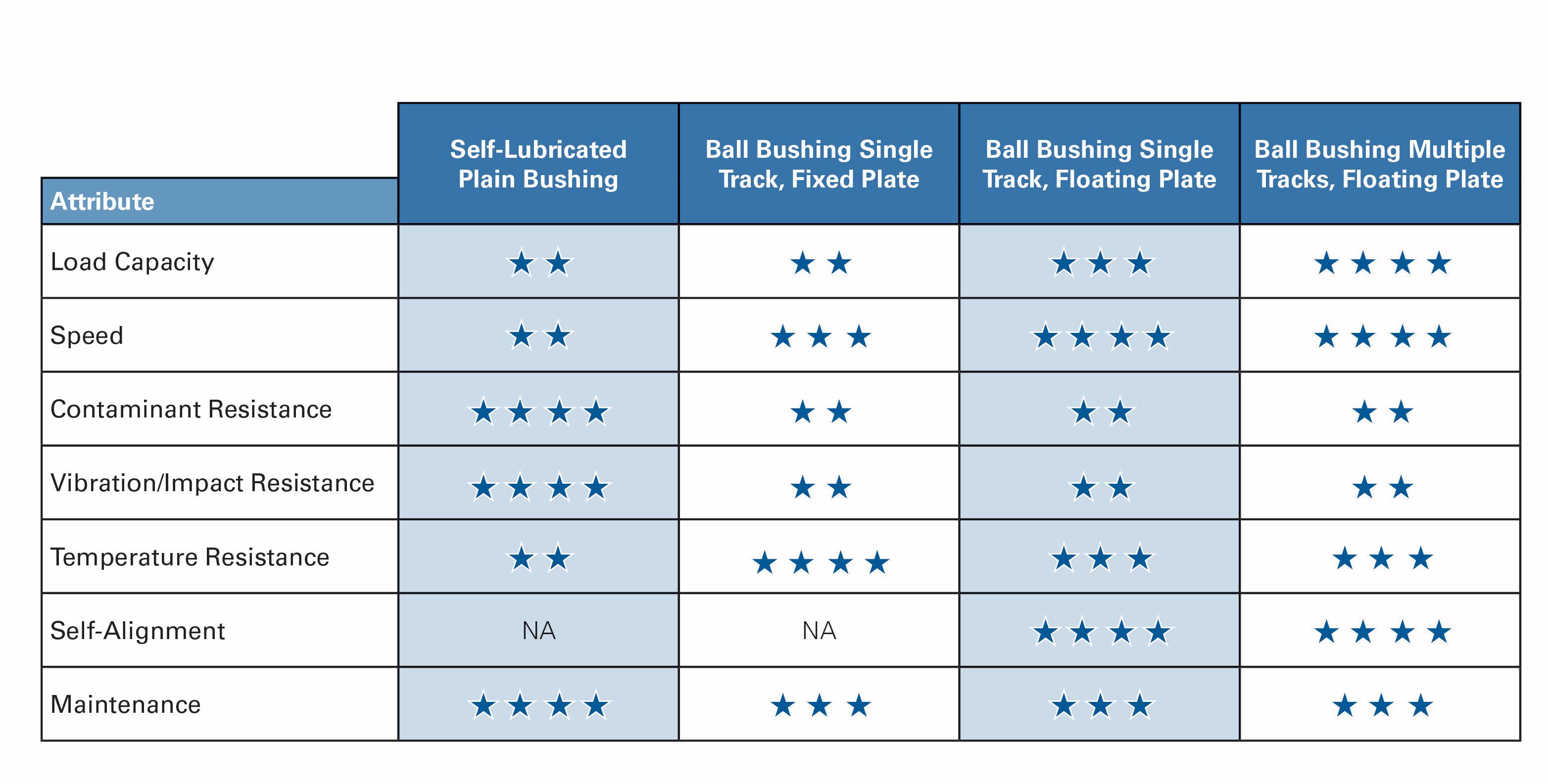 Choosing the right linear bearing can be a make or break decision. Based on your application’s requirements, the table above can help you determine an ideal solution.