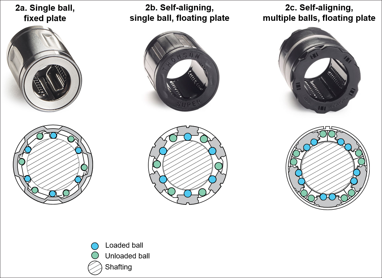 Figure 2: While all three linear bearings pictured use recirculating balls, their difference lies in that 2a employs a hardened sleeve that has a bearing surface ground into it, whereas 2b and 2c utilize floating bearing plates.