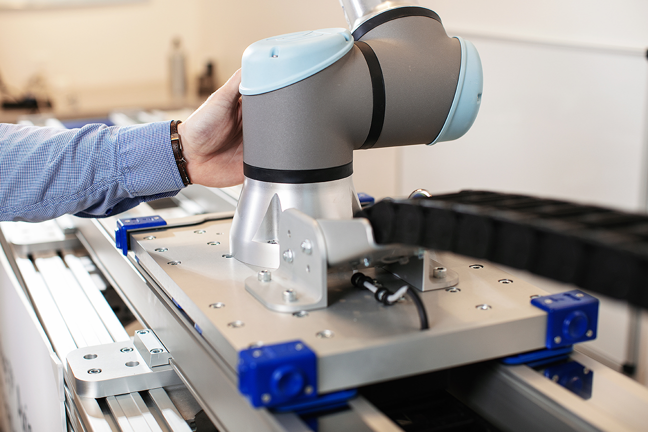 Figure 2. Thomson's MovoTrak CTU uses collision detection paddles to sense unplanned loads from accidental human contact and stop motion. The robot arm is also sensitive to accidental human contact. Image courtesy of Thomson Industries.
